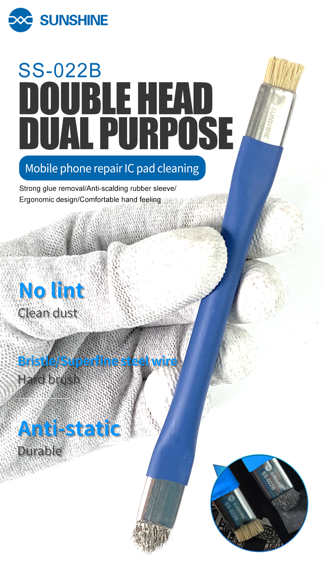 SUNSHINE SS022B Doublehead dualpurpose brush $390 now $261 piece 33% OFF SUNSHINE SS046 3 in 1 Brush $112 now $100 piece 11% OFF Total 2 Products. Not ordinary animal hair, is a special chemical treatment of plastic hair;. Sunshine ss022b safe brush antistatic motherboard pcb cleaning brush for mobile phone repair tools kit ferramentas grade $166 add to cart quick view newest sunshine dtn touch control multimeter newest sunshine dtn touch control multimeter $2150 add to cart quick view r 523k micro uart cable r 523k micro uart cable.