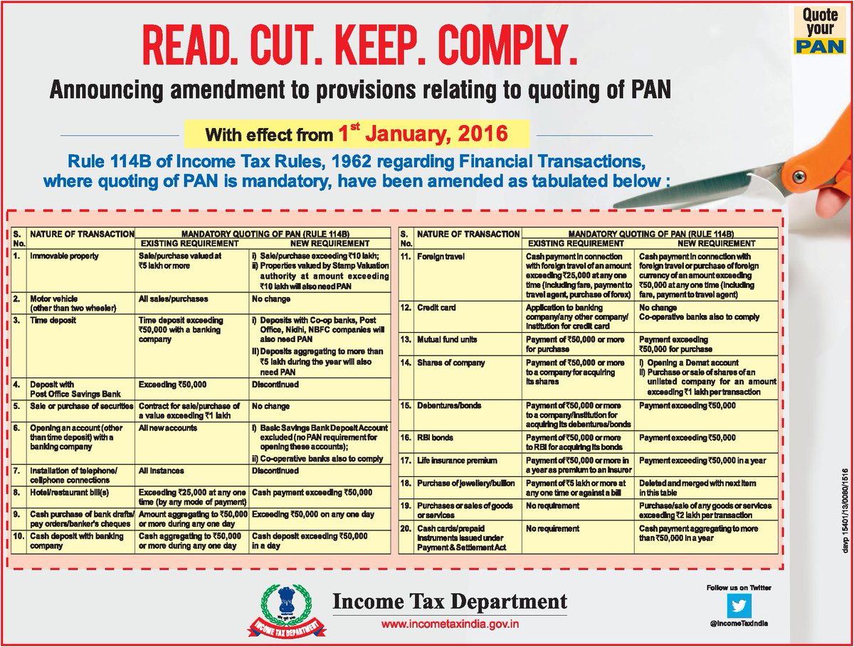 Income Tax India Quoting Of Pan Is Mandatory For The Following Transactions W E F 1st January 16 T Co Sez9gc54xe