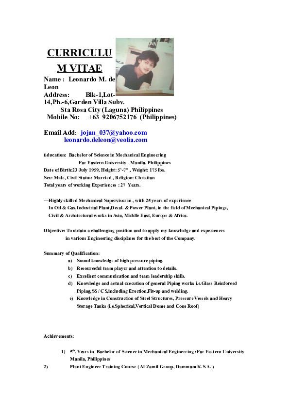 Doc Curriculum Vitae Leonardo De Leon Academia Edu