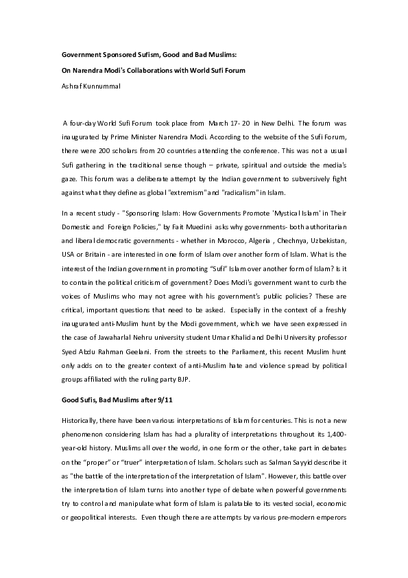 Pdf Government Sponsored Sufism Good And Bad Muslims On Narendra Modi S Collaborations With World Sufi Forum Ashraf Kunnummal Academia Edu