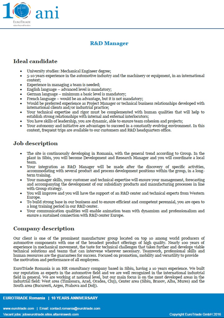 R D Manager Eurotriade Apply On Ejobs