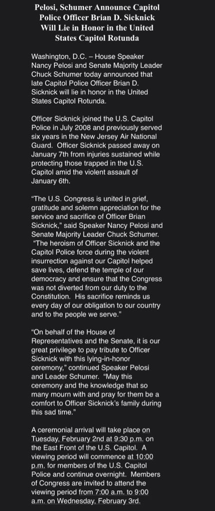 Sicknick was among the Capitol Police officers who defended the US Capitol against a proTrump mob on January 6 He succumbed to injuries sustained during the riot a day later, on January 7. Brian Sicknick, the US Capitol Police officer who was fatally injured during the Jan 6 insurrection at the Capitol complex, has been given the rare distinction of lying in honor in the building's Rotunda. A few days ago, the New York Times quietly “updated” its report, published over a month earlier, asserting that Capitol Police officer Brian Sicknick had been killed by being struck with a fire extinguisher during the January 6 riot According to the update, “new information has emerged regarding the death of the Capitol Police officer Brian Sicknick that questions the initial cause of.