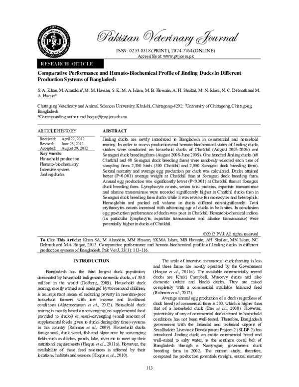 Pdf Comparative Performance And Hemato Biochemical Profile Of Jinding Ducks In Different Production Systems Of Bangladesh Shareeful Islam Academia Edu