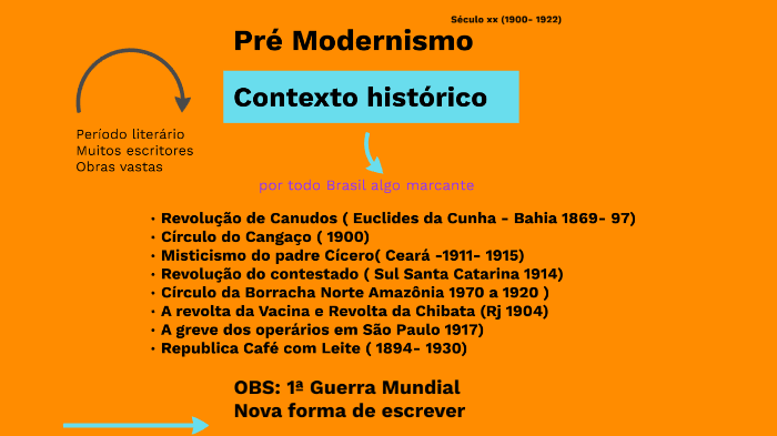 Prémodernismo é como ficou conhecido o período literário brasileiro que vai de 1902 até 1922 Na Europa, o período que antecedeu ao modernismo foi marcado pela tensão política entre os países imperialistas e pelo surgimento dos movimentos de vanguarda Já no Brasil, a Proclamação da República, o surgimento das favelas e a Guerra de Canudos são alguns fatos históricos que levaram os autores desse período a realizarem críticas sociais, econômicas e políticas em suas obras. Por isso, a literatura prémodernista é a literatura que antecede essa passagem de grandes mudanças na história da arte e da literatura O período que se estende, mais ou menos, de 1900 a 1922 é um momento de transição na literatura;. PréModernismo não pode ser classificado como uma corrente estética O PréModernismo engloba as obras que têm algo de tradição e algo de ruptura com a tradição Observamos criações híbridas, representativas de uma fase de transição na Literatura brasileira que irá desaguar no Modernismo.