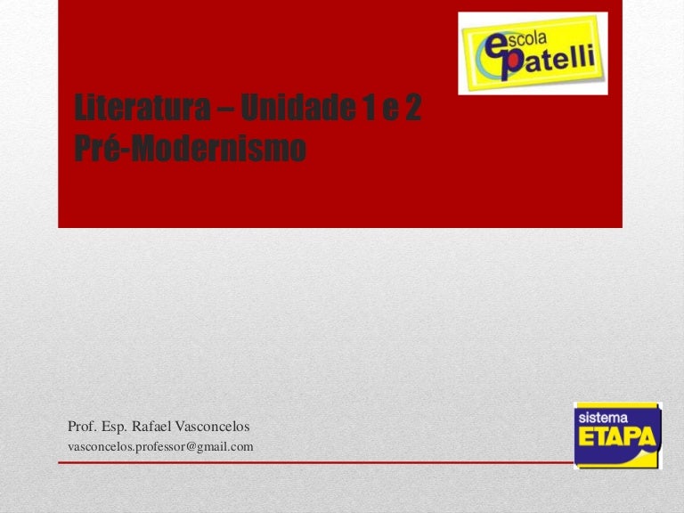 Então você precisa conhecer o PréModernismo, o período de transição entre o Simbolismo e o Modernismo Por isso, o Beduka preparou um. Como referenciar "PréModernismo Características" em Só Literatura Virtuous Tecnologia da Informação, 0721 Virtuous Tecnologia da Informação, 0721 Consultado em /02/21 às 0110. Literatura – Unidade 1 e 2 PréModernismo Prof Esp Rafael Vasconcelos vasconcelosprofessor@gmailcom 2 PréModernismo O PréModernismo foi um período de intensa movimentação literária que marcou a transição entre o simbolismo e o modernismo e foi caracterizado pelas produções desde início do século até a Semana de Arte.
