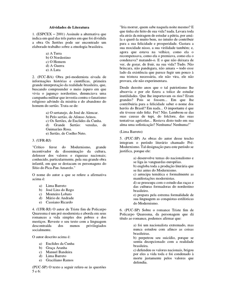 Exercicios De Literatura Pre Modernismo Projeto Medicina