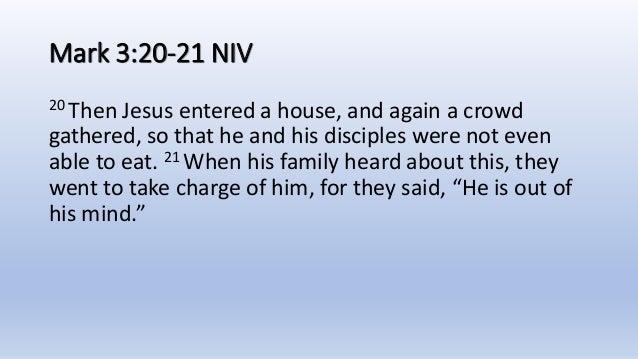 Mark 321 He Is Beside Himself’ Mark The Mistakes of Christ. Mark 335 NIV Then Jesus entered a house, and again a crowd gathered, so that he and his disciples were not even able to eat NIV 21 When his family heard about this, they went to take charge of him, for they said, “He is out of his mind” NIV 22 And the teachers of the law who came down from Jerusalem said, “He is possessed by Beelzebul!. Commentary, Mark 335, James Boyce, Preaching This Week, WorkingPreacherorg, 15 "We will have to be willing to come along for the journey We will just have to trust this Jesus and the invitation to join him and to believe that in his company we will participate in the unfolding of the good news of God's kingdom among us and in our world".
