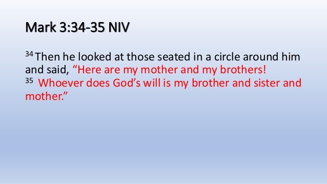Mark 335 For whoever does the will of God, he is My brother and sister and mother' on StudyLightorg. Mark 335 Jesus Accused by His Family and by Teachers of the Law When his family 321 Or his associates heard about this, they went to take charge of him, for they said, “He is out of his mind”. Mark 41 NIV 1 Again Jesus began to teach by the lake The crowd that gathered around him was so large that he got into a boat and sat in it out on the lake, while all the people were along the shore at the water’s edge.