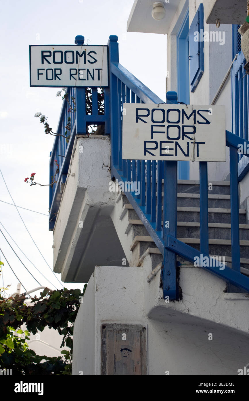 Rooms For Rent Signs In The Old Town Of Mykonos Greece Europe Stock Photo Alamy
