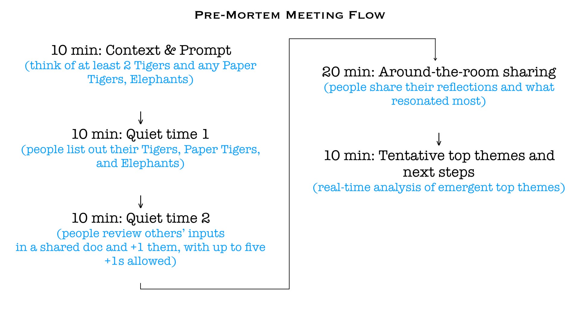 Postmortem meeting best practices In addition to having a solid agenda, you can do a few things to ensure a successful postmortem meeting Set rules for the meeting—Make it clear that there will be no fingerpointing, that the goal is to focus on the parts of the process rather than the people, and that positive attitudes are a mustYou may also want to set rules around distractions like. The full postmortem can be found here Things to keep in mind when doing a postmortem I read a fantastic article by Adrian Hornsby, a Principle Developer Advocate from Amazon In it, he discussed some things to avoid, and things to emphasize in order to write the best postmortem if you are ever the owner of one Here are some things he. A premortem in a business setting comes at the beginning of a project so as to improve the success outcome for the project as opposed to postmortem, an autopsy of failure I think, premortem is a great idea for investment analysis as well.