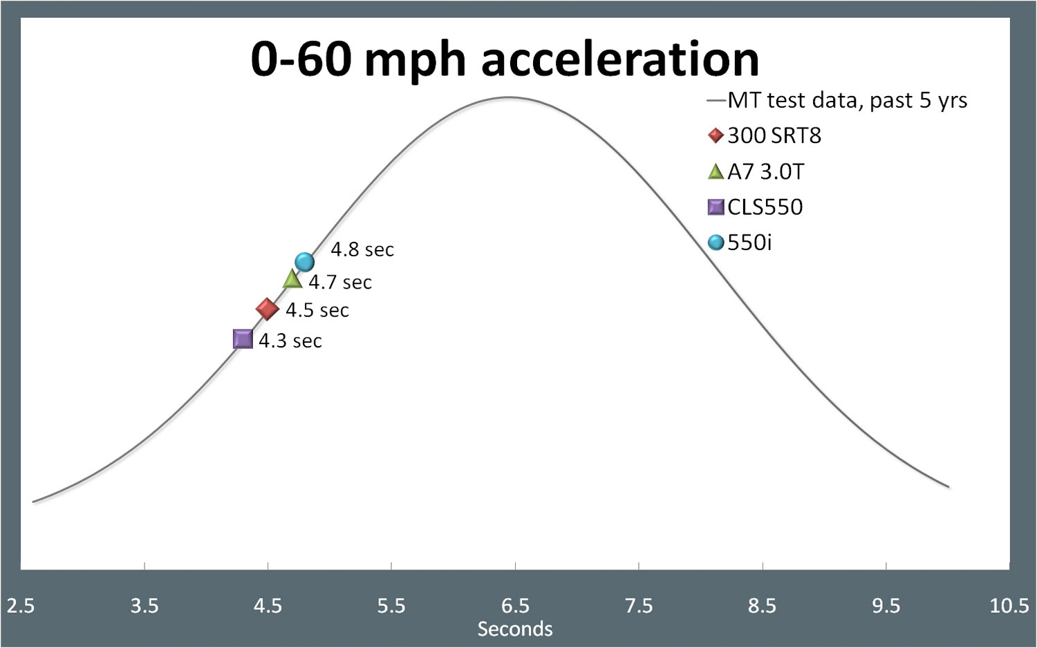 18 Chrysler 300 S 57L V8 RWD 8A 53 sec 138 sec @ 1013 mph 16/25/ mpg Motor Trend 17 Chrysler 300 S 36L V6 RWD 8A 63 sec 150 sec @ 96 mph 19/30/23 mpg Car and Driver 15 Chrysler 300 C V6 36L V6 AWD 8A 66 sec 150 sec @ 95 mph 18/27/213 mpg Motor Week Limited V6 36L V6 AWD 8A 63 sec 148 sec @ 96 mph 18/27/22 mpg. The time in seconds that a vehicle takes to reach 60 mph from a standstill with the engine idling The bold styling of the Chrysler 300 draws a lot of attention, but in most ways the V6. My 18 300C 57 runs 132 quarter mile at 103 mph 060 timed at 52 seconds I would guess the 157 would be for a V6 The Car & Driver article is closer to my actual performance numbers of my 300C Reply 13k 2 replies.
