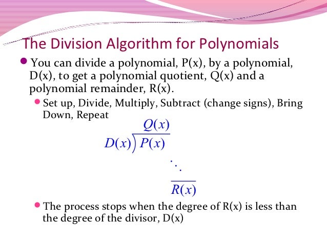 The Factor Theorem states that if P/Q is root of a polynomial then this polynomial can be divided by q*xp Note that q and p originate from P/Q reduced to its lowest terms In our case this means that x 327x54 can be divided by 2 different polynomials,including by x6 Polynomial Long Division 12 Polynomial Long Division Dividing x 327x54. Long division rules The long division rules are explained in 12 steps for a case in which the dividend is a 3 length number, while the divisor is a 2 length one 1st step establish the dividend (the number to be divided) and the divisor (is the number “y” we often refer to in sentences like divide the dividend x by the divisor y). Long Division Calculator This calculator shows all the work and steps for long division Long Division Worksheets Remainder Applet and Visualizer Long Division Game.