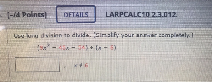The calculator will divide the polynomial by the binomial using synthetic division, with steps shown Show Instructions In general, you can skip the multiplication sign, so `5x` is equivalent to `5*x`. This video describes easy method for Division It presents a step by step instructions to solve seemingly complex division problems using the Long division m. What is the remainder when 599 is divided by 9?.