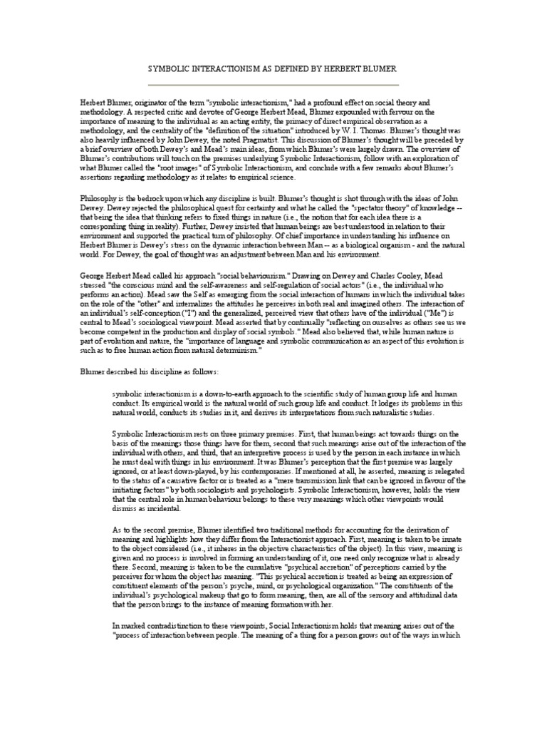 Symbolic Interaction Ism As Defined By Herbert Blumer Sociology Thought