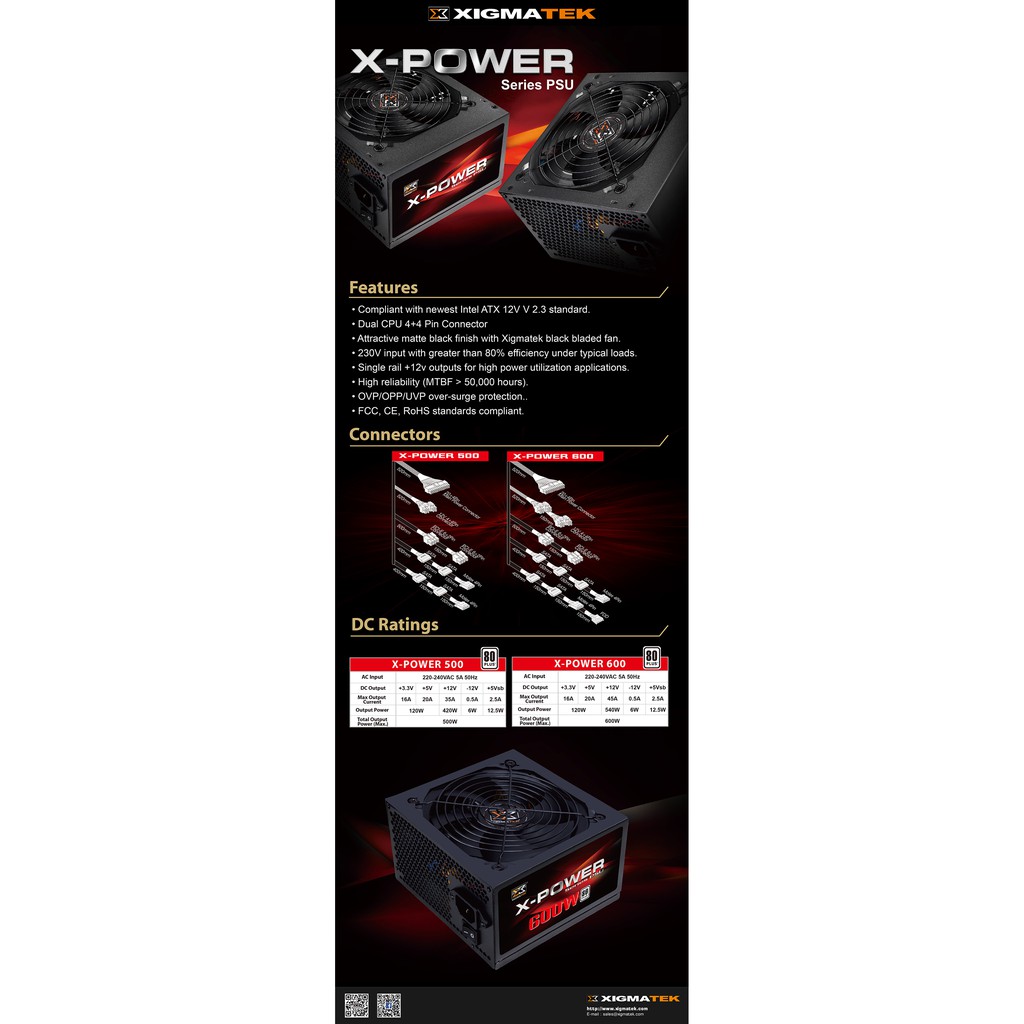 Xigmatek XPOWER 500W 80 Plus;. Compliant with newest Intel ATX 12V V 23 standard Dual CPU 44 Pin Connector;. EN XIGMATEK XPOWER 600W X CALIBRE 600 230V CE 80PLUS EN XIGMATEK XPOWER 500W X CALIBRE 500 230V CE 80PLUS EN XIGMATEK XPOWER PRO 650W FULLY MODULAR 230V 1 YEAR WARRANTY Manufacturer’s Link.