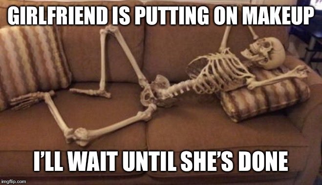 He said "i'll be there in 5 minutes" he said "i'll be there in 5 minutes" Waiting skeleton meme 3 Waiting for my girlfriend to get ready She said it would only be a few minutes Waiting for my girlfriend to get ready She said it would. Also called waiting skeleton, still waiting, skull, i'll just wait here guy, skeleton waiting, skeleton still waiting, waiting indiana jones Caption this Meme All Meme Templates Template ID. Being from Pennsylvania is like being in a family You can pick on each other You can make fun of your home state.