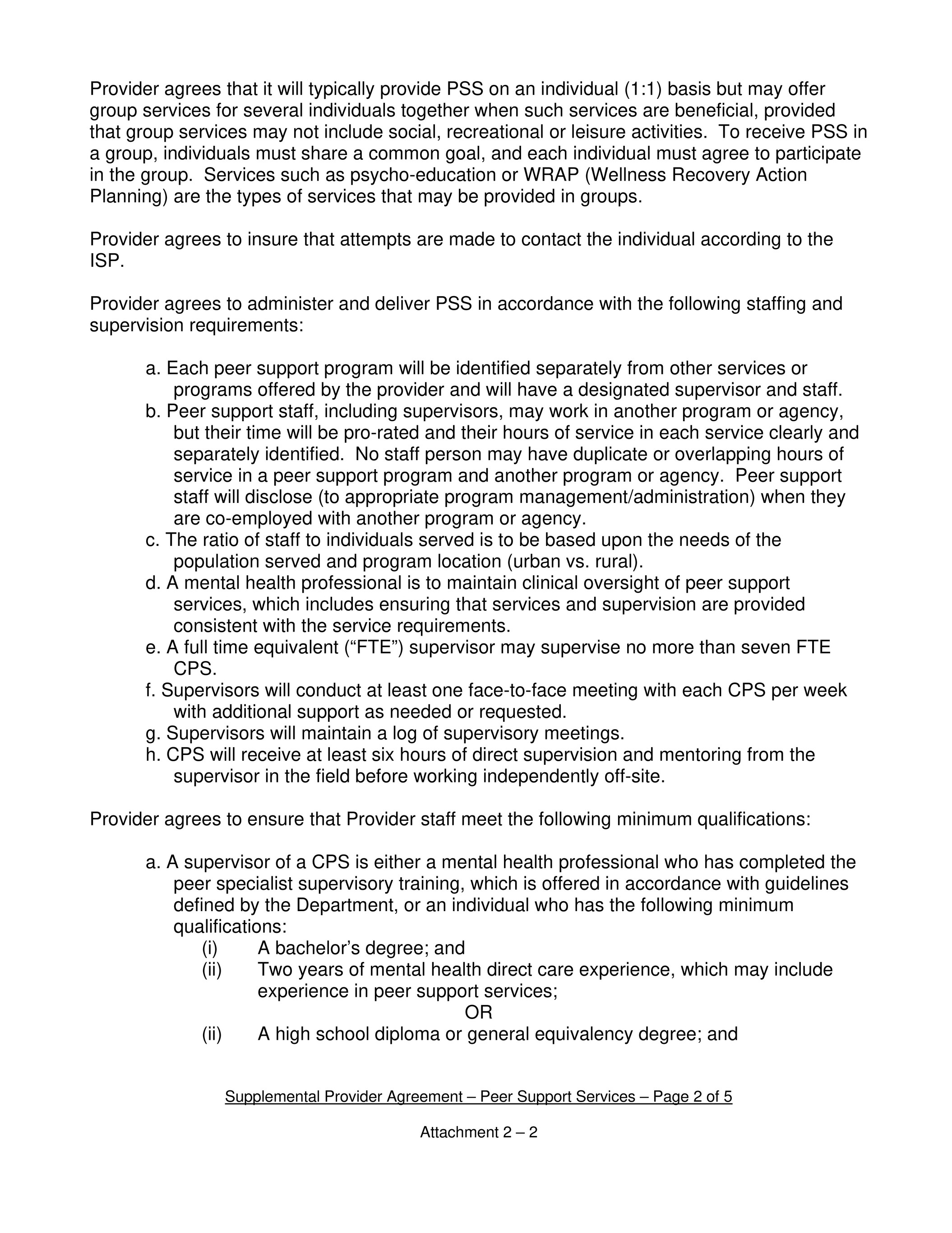 Stage 1 Exposure Tips With any new idea, the first step is to provide people with lots of information about the idea, and an opportunity to talk about it and ask questions Helpful ways to build support for Peer Specialists are Identify a facility champion or a coordinator for peer support. To provide supervision for peer supporters, supervisors must have an understanding of peer support, its history, best practices, and common concerns If a person does not understand the role of the peer specialist, they are unlikely to offer adequate supervision and may create conflict and confusion. Peer Support Specialist Supervisory Agreement –Completed and signed by you and your Board Approved Supervisor 10 Peer Support Specialist Verification of Supervision –25 hours of direct supervision documented and signed by your Board Approved Supervisor 11 Supervision Evaluation for Peer Support Specialist –Completed and signed by your supervisor 12 Two letters of reference from credentialed alcohol and drug.