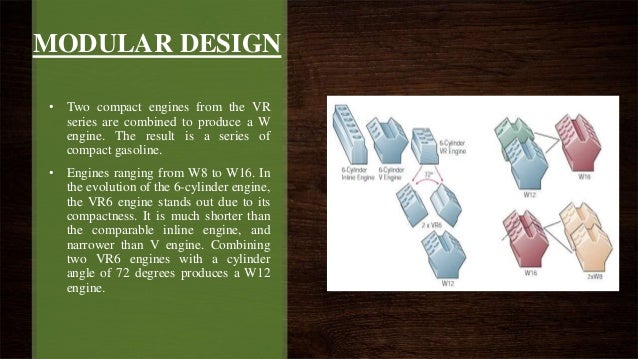 W engine design. Bentley's W12 is one of the most interesting engines on sale today It's called a "W" because, instead of a traditional V shape, the cylinders are laid out in two stacked vees. W engines The engines of the W family are a combination of two "VR banks" based on a modular design principle The cylinders of one bank have an angle of 15° relative to each other while the two VR banks are arranged at a Vangle of 72° 15 15 72° S248_008 S248_009 S248_007 S248_010. V Engine Construction The V engine is a newer generation compact engine design This engine construction places the cylinders at an angle instead of in a straight line with each other The angle between the cylinders varies from 60 to 90 degrees The angle between the cylinders form 'V' shape, and that is why this engine is called the 'V' type.