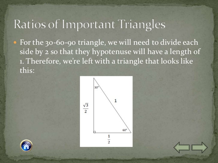 Angles 60 degrees and 1 degrees We know this because based on the unit circle, sin 60 = (sqrt3)/2 And based on the CAST rule, an acute angle of 60 in the 2nd quadrant also gives positive (sqrt3)/2 To find that angle in the 2nd quadrant, take , which gives you 1 So there are 2 solutions, 60 and 1. A 30 60 90 triangle is a special type of right triangle What is special about 30 60 90 triangles is that the sides of the 30 60 90 triangle always have the same ratio Therefore, if we are given one side we are able to easily find the other sides using the ratio of 12square root of three This special type of right triangle is similar to the. 8 Distribute one A triangle to each student Label the 30°, the 60°, and 90° angles Using the hypotenuse length of one unit, have students determine the leg lengths and label the lengths in the boxes (1/2 and √3/2) Use those side lengths to investigate the coordinate points of the intersection of the lines that were just made.