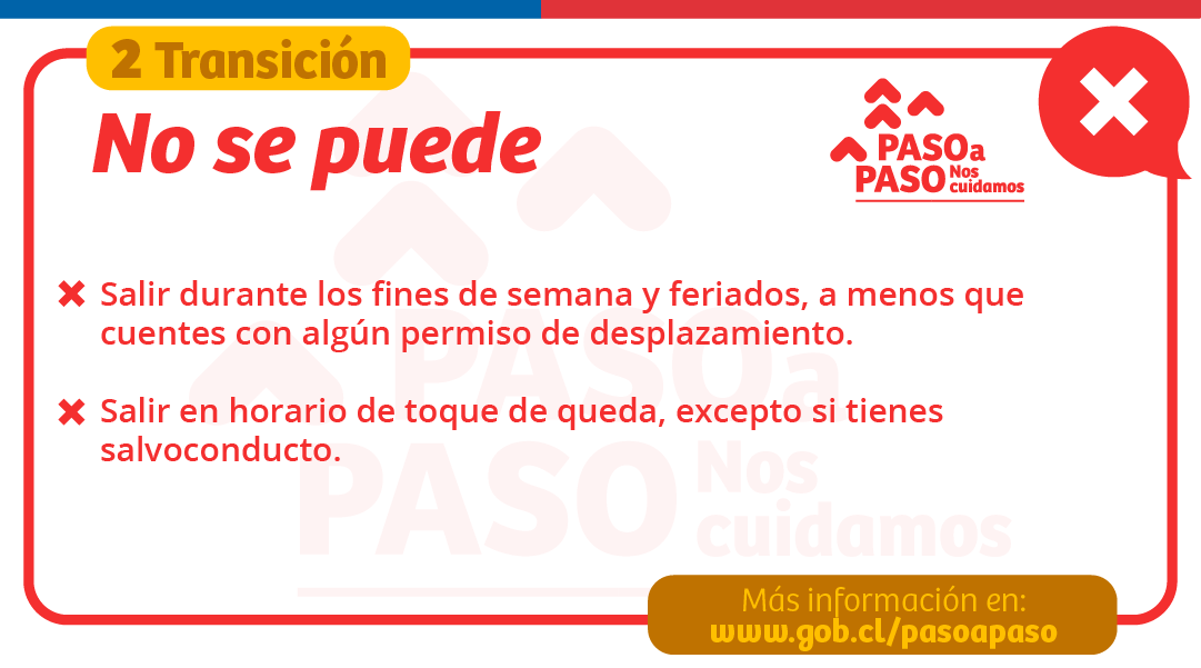 Paso a paso fase 2 transicion. Si vives en una comuna con playa y está en Paso 2 (Transición), puedes ir solo de lunes a viernes. Estas modificaciones representan cambios en las fases de Cuarentena (Paso 1), Transición (Paso 2), Preparación (Paso 3) y Apertura Inicial (Paso 4) y comenzarán a partir de este jueves 14 de enero a las 05:00 horas de la mañana. “Es así que la comuna de Quilleco retrocede a Fase dos desde el próximo jueves 18 a las 05 horas, mientras que la comuna de Laja avanza a Fase 2 desde este martes 16 a partir de las 5 am”, detalló.