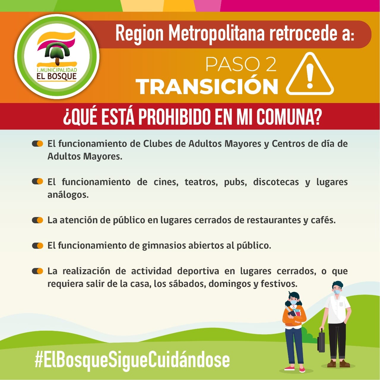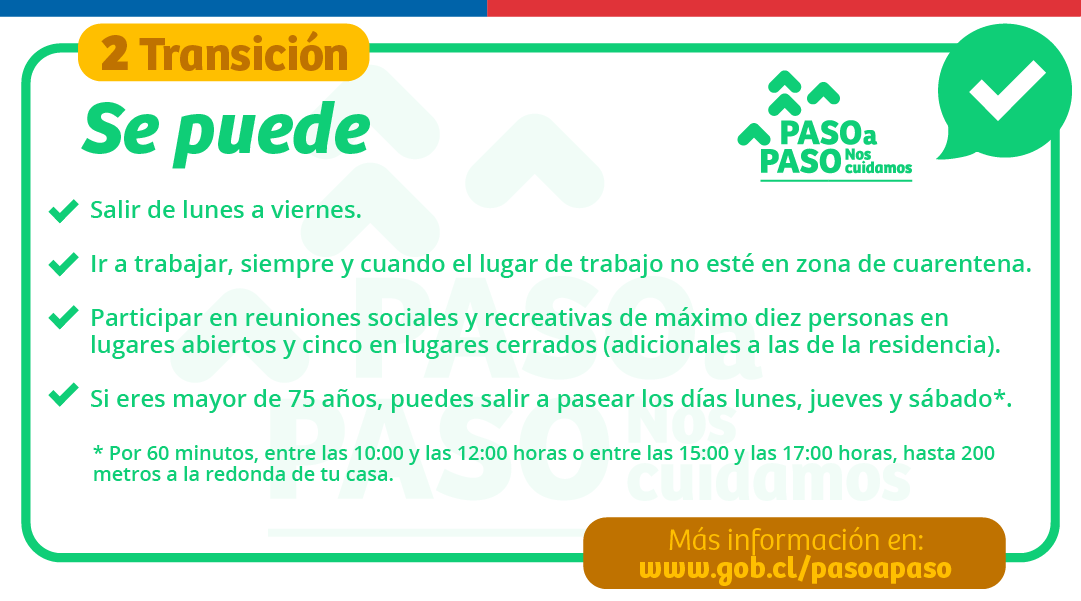 En el caso de la Fase 2 –Transición– donde hoy se encuentra gran parte de la Región Metropolitana, la principal modificación es la restricción de. Por otra parte, en el plan Paso a Paso del Gobierno, Lagos anunció que “dos de nuestras comunas presentarán cambios”.