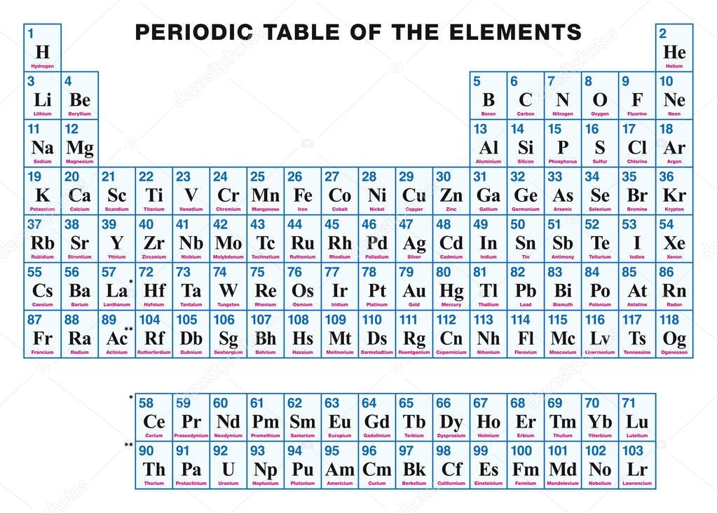 Periodic Table Of The Elements English Tabular Arrangement Of The Chemical Elements With Their Atomic Numbers Symbols And Names 118 Confirmed Elements And Complete Seven Rows Illustration Vector Premium Vector In