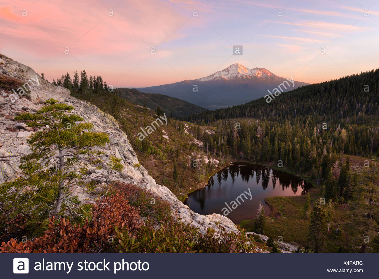 The Usa America Mt Shasta Mountain Lake Heart Lake California Light Colour Atmosphere Rock Stock Photo Alamy
