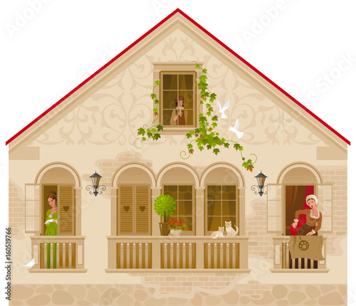 Retro Stone House With People In Windows Vector Illustration Vintage Street Architecture Victorian Style Building Poster Template Cute Cartoon Beautiful Senior And Young Citizens Kids Adults Buy This Stock Vector And