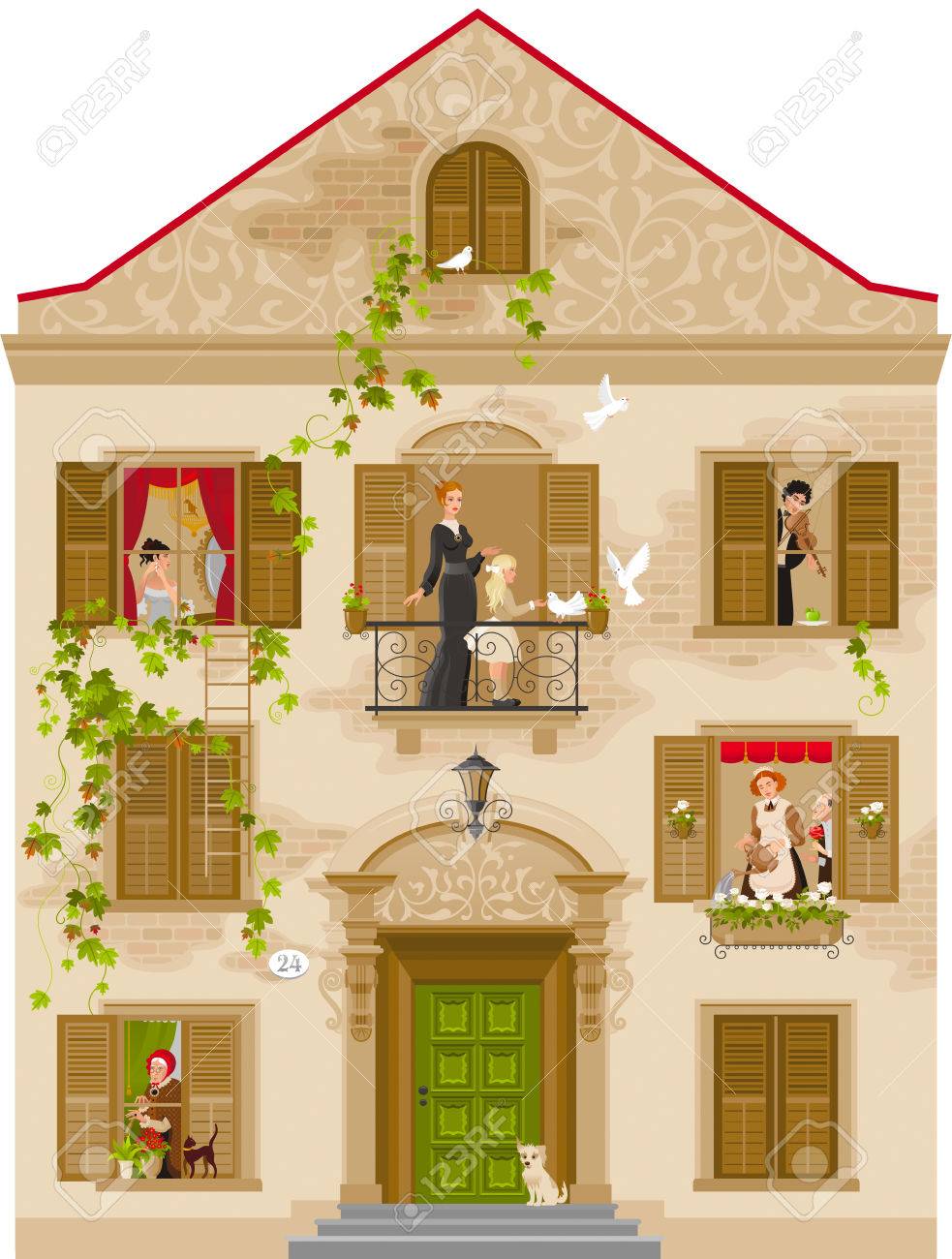 Retro Stone House With People In Windows Vector Illustration Royalty Free Cliparts Vectors And Stock Illustration Image