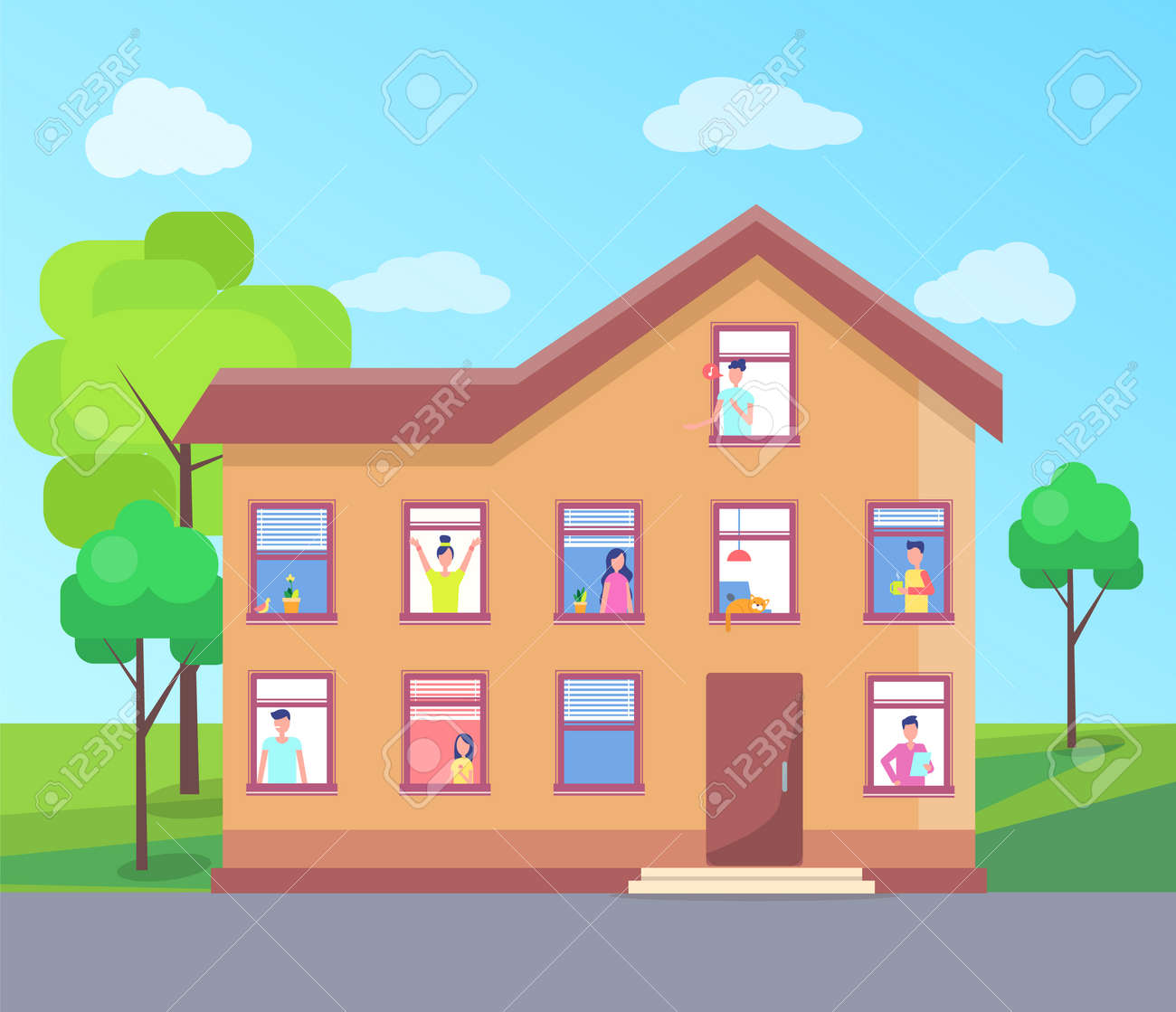 Neighbors Cartoon People In Apartment House Windows Neighborhood Vector Concept Building With Win Building Illustration Cartoon People Character Illustration