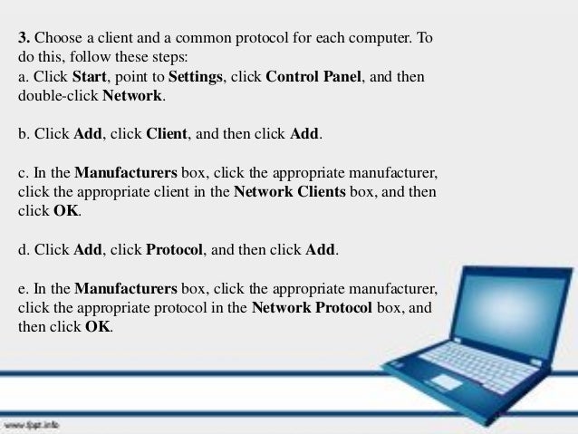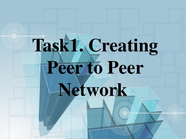Access the Network and Sharing Center section of Control Panel by opening Control Panel and then selecting that option Or, in Category view, first, choose Network and Internet Choose the link called Setup a new connection or network Select the option called Set Up a Wireless Ad Hoc (ComputertoComputer) Network. A peertopeer network is one in which two or more PCs share files and access to devices such as printers without requiring a separate server computer or server software. Go to the properties of the network, go to network components, select "Protocol TCP / IP» Click on the "Properties", set a static address for the computer, for example, , Subnet Mask, enter For each computer list the corresponding address, replace the last digit, and the name of the working group, for example, HomeNet.