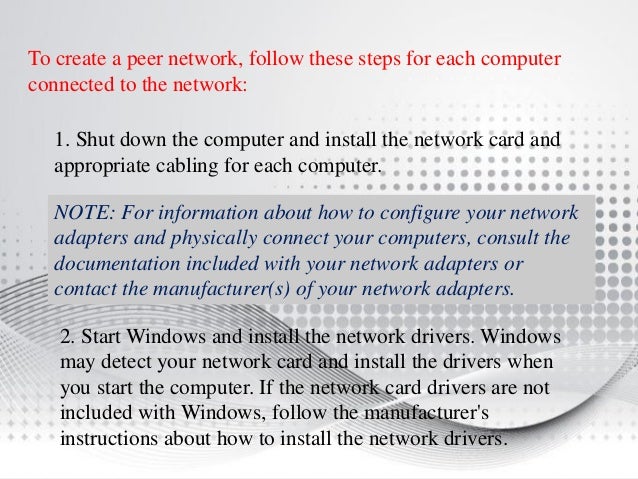 INSTRUCTIONS FOR A PEER TO PEER NETWORK OF WINDOWS 7, WINDOWS 8 AND WINDOWS 10 COMPUTERS Applies to This step is CRITICAL – many networking slowdown issues stem from a computer using too many resources to hunt for a wireless connection that has been degraded due to smart phones in the vicinity. A peertopeer network is one in which two or more PCs share files and access to devices such as printers without requiring a separate server computer or server software. Launch File Explorer on the Taskbar and click Network You should see the other computer (s) appear in Network Explorer If not, you’ll get prompted to Turn on network discovery and file sharing Depending on the type of network connection, click the appropriate option.