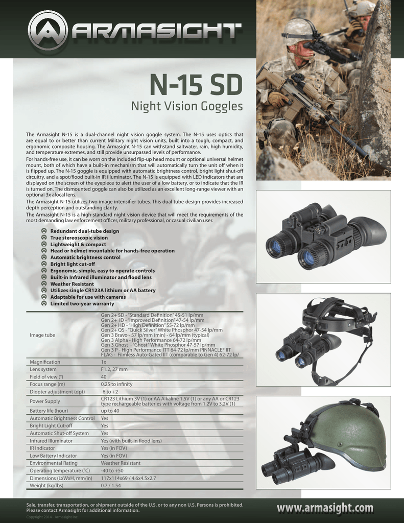 Make Offer Armasight N15 Compact Dual Tube Gen 3 Night Vision Ghost White Phosphor ATN Night Cougar Gen 1 Night Vision Goggles with Head Mount Great Condition $. Armasight N15 HD Night Vision Goggles NSGNDH1 Generation 2 HD night vision binocular/goggle combo. N15 Night Vision Goggles 113 PURPOSE OF EqUIPMENT To provide the operator with the ability to observe at night under moonlight and starlight conditions The N15 can be used as a handheld, headmounted or helmetmounted device to allow walking,.
