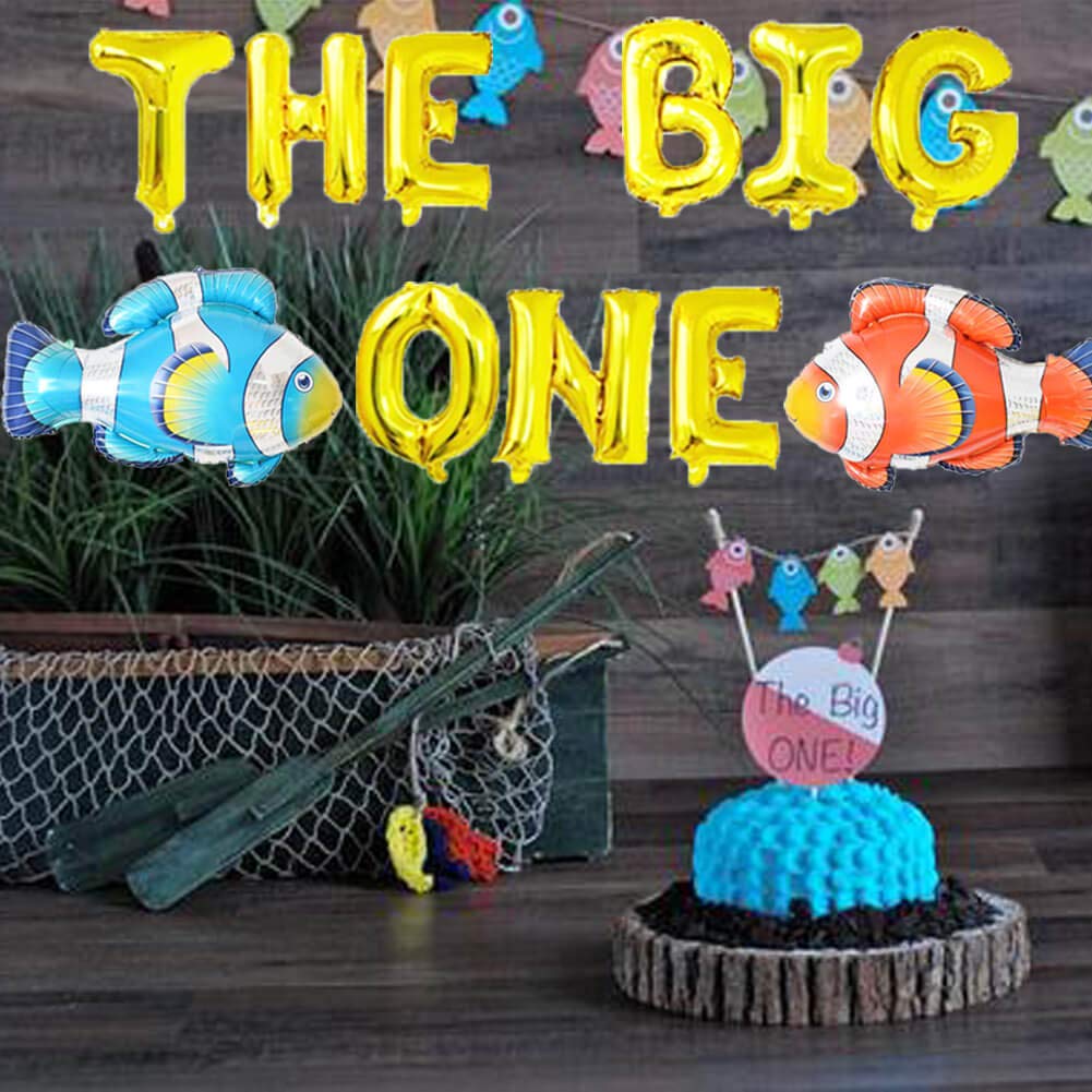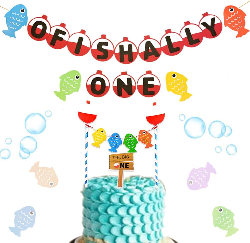 The Big One Cake Topper Bobber Gone Fishing Theme Little Fisherman Baby First Birthday Reel Fun Ideas O Fish Ally One Photo Props Decorations A Reel Fun Baby 1ST Birthday Party SuppliesThis adorable and colorful little fishes and bobbers designs cake topper which will be appreciated by your guests, perfect for baby first birthday party cake smash, photo props, nursery decor. "The Big ONE" A tackle box, wood stumps, picture frames, lake quotes, fish scale cupcake liners, fish net, cutout fish, number 1, wooden box, blue sparkly 'shimmery lake' fabric, fishing net, oar, fish cupcakes, fish cookies, and meringue 'fish farts' cookies completed this display. This will add some really cool decorations and bring the Under the Sea theme to life attach a piece of string to the Tropical Fish and have them hang from the ceiling If you incorporate some hanging Blue Paper Lanterns it will seem like you are having the party under water.