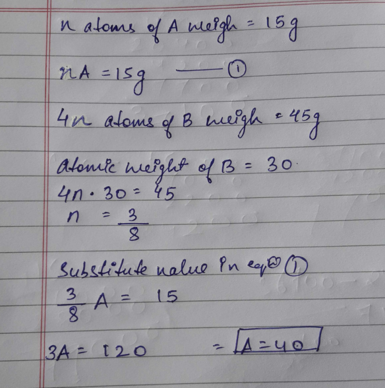 If N Atoms Of Element A Weigh 15 G And 4n Atoms Of Element B Whose Atomic Weight Is 30u Weigh 45g Determine The Atomic Weight Of A Edurev Class 11 Question