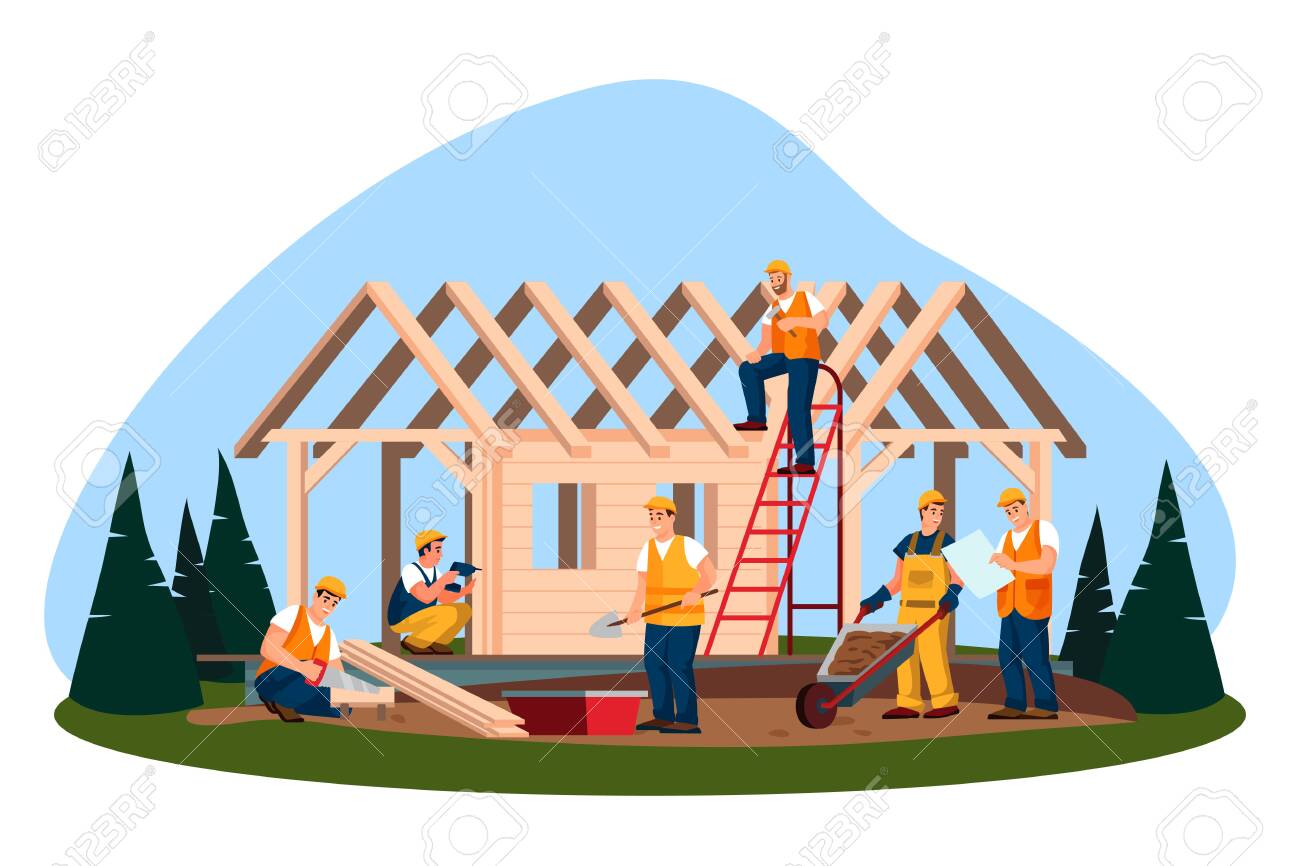 Wooden Eco House Construction Process Vector Flat Cartoon Illustration Royalty Free Cliparts Vectors And Stock Illustration Image
