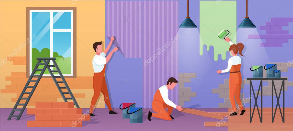 Repair Home Service Vector Illustration Cartoon Flat Repairman Worker People Work On House Renovation Paint Wall With Roller Glue Wallpaper Handyman Characters Group Repairing Building Background Premium Vector In Adobe Illustrator