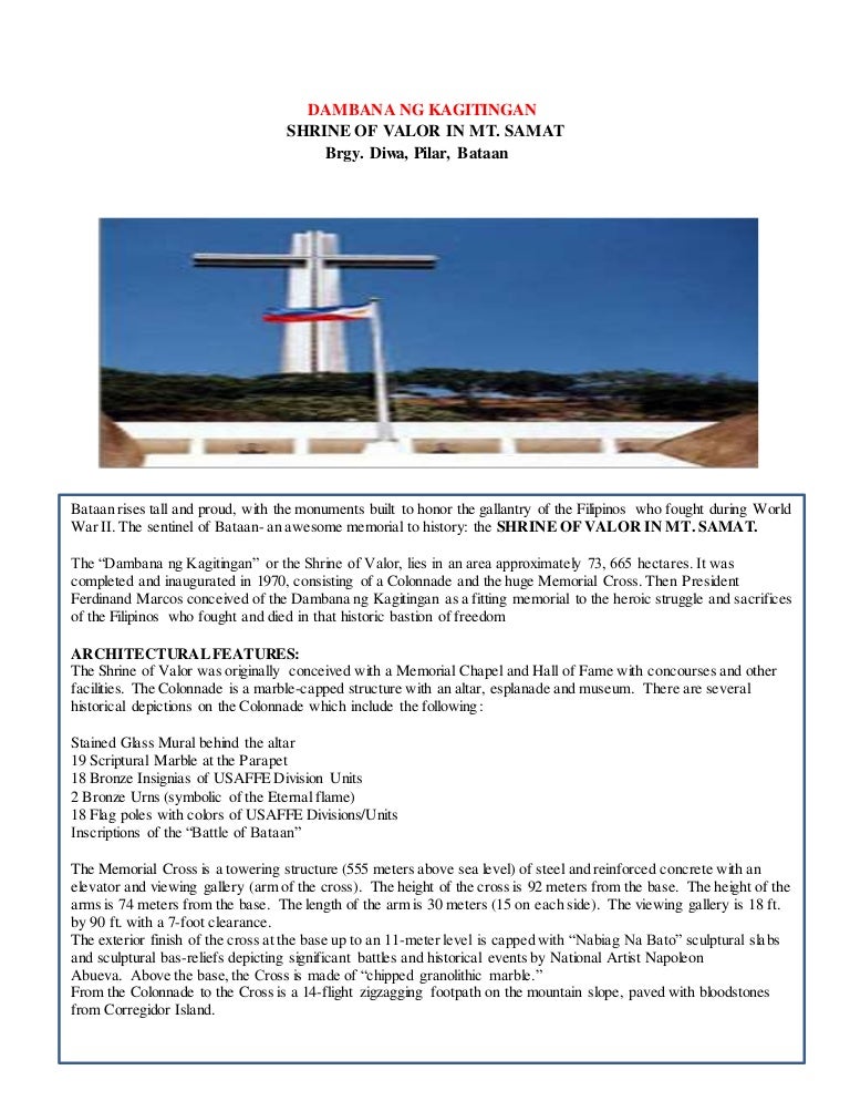 The celebration is always stage in Dambana ng Kagitingan of MtSamat, Bataan Mabuhay ang magigiting na bayani ng digmaan!. SAMAT Brgy Diwa, Pilar, Bataan Bataan rises tall and proud, with the monuments built to honor the gallantry of the Filipinos who fought during World War II The sentinel of Bataan an awesome memorial to history the SHRINE OF VALOR IN MT SAMAT The “Dambana ng Kagitingan” or the Shrine of Valor, lies in an area approximately 73, 665. Mount Samat National Shrine (alog pronunciation samats) or Dambana ng Kagitingan (Shrine of Valour) is a historical shrine located near the summit of Mount Samat in the town of Pilár, Province of Bataan, in the Republic of the Philippines.