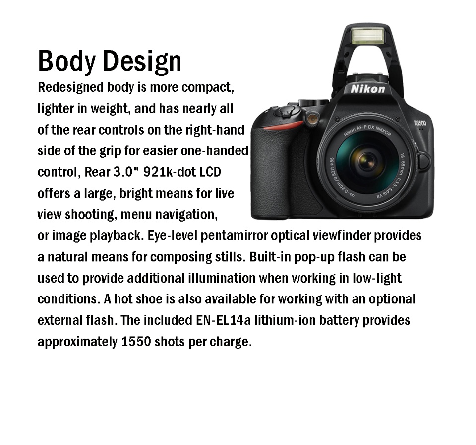 Nikon D3500 W/ AFP DX NIKKOR 1855mm f/3556G VR Black $5 Only 11 left in stock order soon But for the same price in a couple years you will be able probably to buy a much better camera body So to me it's much smarter to invest in a great lense then in the latest and greatest camera. The Nikon D3500 is a 24 Megapixel entrylevel DSLR with an APSC CMOS sensor, that is cheaper, lighter, and has a longer battery life than the D3400 that it replaced It was designed with the new photographer in mind and features a Guide Mode that will essentially teach you how to shoot in various situations. The Leading Online Shopping Mall in Malaysia Lazada Malaysia "(Ecart Services Malaysia Sdn Bhd (9365K)" is pioneering ecommerce across some of the fastest growing countries in the world by offering a fast, secure and convenient online shopping experience with a broad product offering in categories ranging from fashion, consumer electronics to household goods, toys and sports equipment.