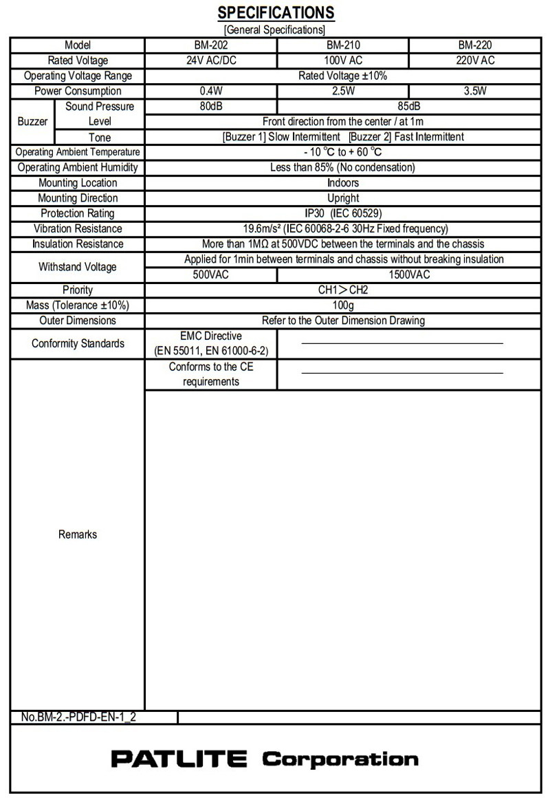 Patlite BM2HFC001 Signal Horn Since 1974, Your Single Source for HVAC, Controls, and Electromechanical Components. Buy Patlite BM Series Signal Horn, Part No BM2HFC001 2 channel, high volume, 90dB at 1m, 24V AC/DC (50/60Hz), NPN/PNP opencollector, IP30. BM Series Buzzer Specifications Part Number BM2H BM212H Price $3300 Description Buzzer Rated Voltage 24V AC/DC 1VAC Operating Voltage Range Rated voltage ± 10% Rated Power Consumption 04 W 25 W Maximum Volume 85dB @ 1m 90dB @ 1m Tone Type Buzzer 1 Slow intermittent Buzzer 2 Fast intermittent.