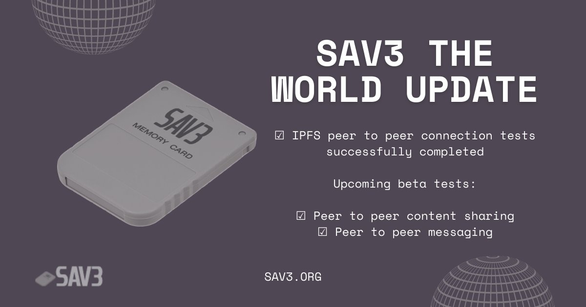 Sav3 Sav3 The World Update Ipfs Peer To Peer Connection Tests Successfully Completed Upcoming Beta Tests Peer To Peer Content Sharing Peer To Peer Messaging Specific Beta Test Dates