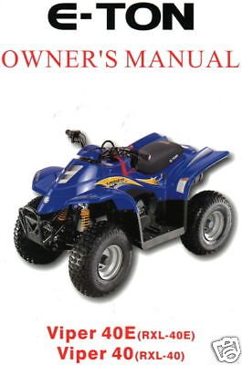VIPER 70(08) 4STROKE ATV6A 70Part Manual VIPER 90 RXL90Part Manual VIPER 90R RXL90RPart Manual VIPER 90R RXL90R4S TYPE1 Part Manual VIPER 90R(08) 4S ATV6A TYPE2 90RPart Manual VIPER JUNIOR JXLRXL40Part Manual VIPER JUNIOR RXL40EPart Manual VIPER MINI 50 RXL50MPart Manual VIPER ST (EP) EXL50Part Manual VIPER ST. Lightening AXL 50 Viper RXL 50 Viper RXL 50M Thunder AXL 90 Viper RXL 70 Viper RXL 90 Viper RXL 90R Viper RXL 40 Viper RXL 40E Impulse TXL 50 Sierra DXL 90 Rascal IXL 40 Yukon CXL 150 Yukon YXL 150 Viper RXL 150 $2999 $4199 $2499 $3299 $2999 $7999. ETON 03 ETon Viper50 RXL50, 03 ETON VIPER MINI 50 YOUTH ATV IN NICE CONDITION The new line of ETON Youth ATV's has arrived The Viper series has a sleek racing style body powered by our 50cc or 90cc 2 cycle engines Both the Viper50 and Viper90 are designed with our sure stop rear HydraDisc disc brake and dual premium front drum brakes.