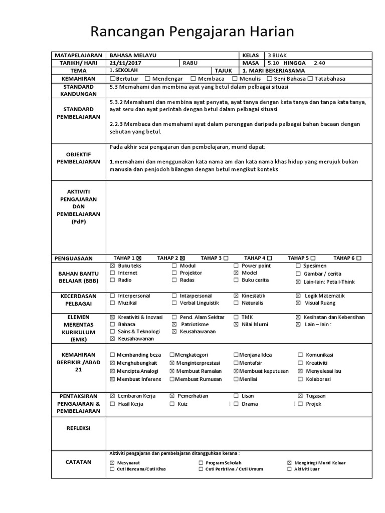RPH 1 3 RANCANGAN PENGAJARAN HARIAN BAHASA MELAYU TAHUN Intrapersonal Verbal linguistik Nilai Murni Bertanggungjawa b Berhemah tinggi Langkah 2 (15 minit) 1 Guru menerangkan kepada muridmurid tentang jenis Ayat terdapat dalam petikan yang disediakan 3. Ada erph untuk kelas bercantum kah?. Tahun 3 Bahasa Melayu RPH Bahasa Melayu Tahun 3 (1) RPH Bahasa Melayu Tahun 3 (2) RPH Bahasa Melayu Tahun 3 (3) PdPc (Pengajaran dan Pemudahcaraan) Bahasa Melayu Tahun 3 (SB) Bahasa Inggeris RPH Bahasa Inggeris Tahun 3 (1) RPH Bahasa Inggeris Tahun 3 (2) RPH Bahasa Inggeris Tahun 3 (3) English Primary Year 3 SJK Scheme of Work (SOW).