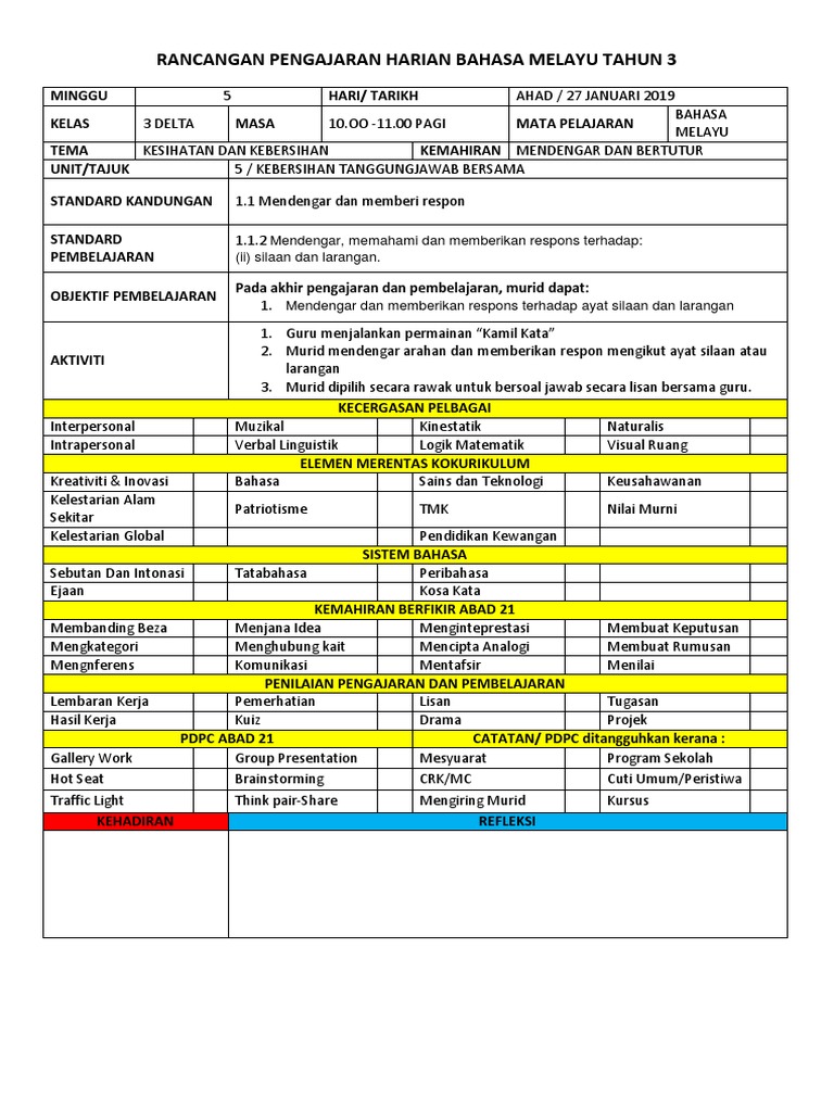 Doc Rancangan Pengajaran Harian Bahasa Malaysia Tahun 3 Kssr Victoria Carl M Academia Edu