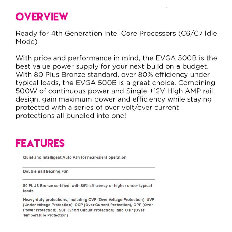 With 80 Plus Bronze Standard, Over 80% efficiency under typical loads, The EVGA 500B is a great choice Combining 500 W of continuous power and single 12 V high amp rail design, gain maximum power and efficiency while staying protected with a Series of over volt/over Current protections all bundled into one!.
