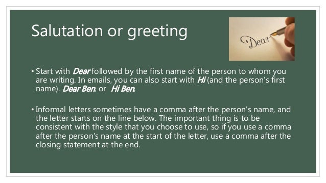 "Hello" is a good example of that And if you want to know where the verb is, you can consider "hello" to be short for I greet you hello Likewise, hello!. “Hi (waits a second or two) Kelly” No, you say “Hi Kelly” That expression is one complete unit by itself;. • a comma for a personal letter • a colon for a business letter • either punctuation mark in an email (The colon is formal) But remember, “Dear” isn’t required in email, even when writing to a stranger Try one of these two openings if you want to sound professional without using “Dear” • Hello, Ms Juliar Fadillah.