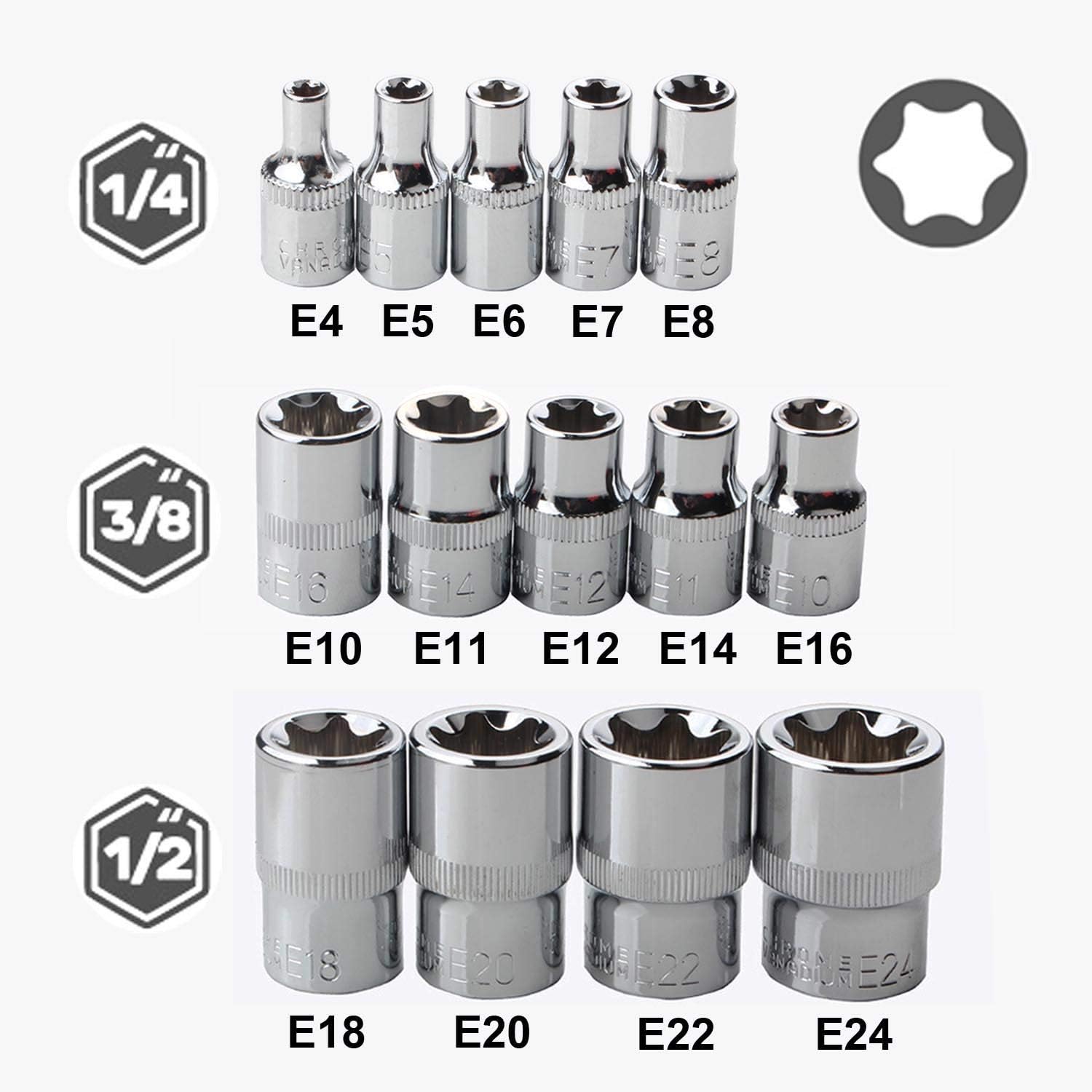Product Overview Husky External Torx Sockets are specially designed to be used with Torx style fasteners commonly found on motorcycles, import vehicles, disc breaks, and electronics This set contains 13 different sizes spanning from E4 to E24 using 1/4 in, 3/8 in and 1/2 in drives. TienI provides detailed torx screw & star socket Size chart Feel free to contact TienI, the supplier of consistent quality start socket and torx socket bit for Torx Screw. Work on cars, trucks, appliances, lawn equipment, machinery, and other jobs requiring star/torx fasteners/bolts.