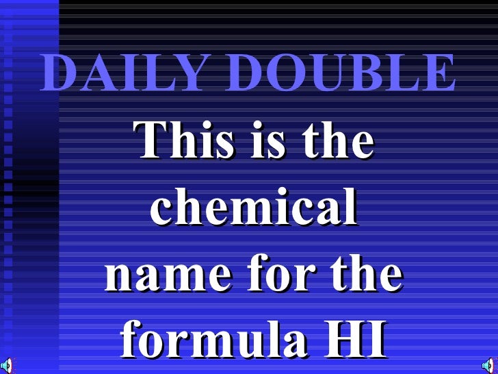 Daily Used Chemicals Interactive formula of chemicals used in daily life. Chemistry Formulas Practice stimulates students’ mastery of the fundamental skill of naming compounds and writing formulas The practice categories include ionic and molecular compounds, acids, bases, polyatomic ions, hydrocarbons, and organic functional groups Students may choose their pace as they work from formula to name or name to. Reactions Hydroiodic acid reacts with oxygen in air to give iodine 4 HI O 2 → 2 H 2 O 2 I 2 Like other hydrogen halides, hydroiodic acid adds to alkenes to give alkyl iodides It can also be used as a reducing agent, for example in the reduction of aromatic nitro compounds to anilines Cativa process The Cativa process is a major end use of hydroiodic acid, which serves as a co.