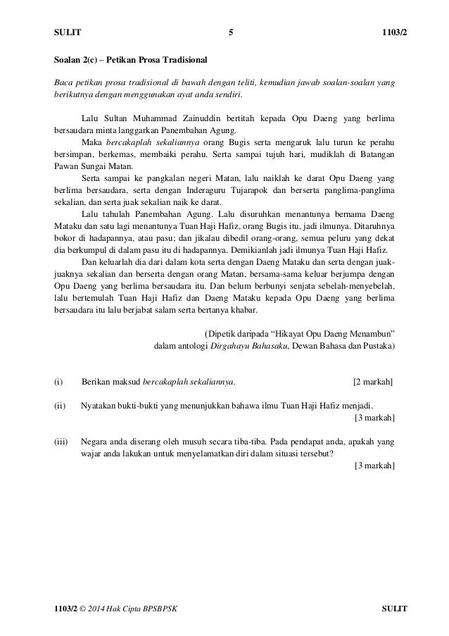 Bahasa Melayu Kertas 1 Ketua Pengawas Peperiksaan mengarahkan calon mengisi butiran pada muka hadapan Buku Jawapan 145 tengah hari 150 tengah hari 0 petang 430 petang 2 jam 30 minit 1103/2 Bahasa Melayu Kertas 2 Ketua Pengawas Peperiksaan mengarahkan calon mengisi butiran pada muka hadapan Buku Jawapan 745 SELASA 23 Februari 21 pagi 750. Bahasa Melayu Calon dikehendaki membaca maklumat di halaman belakang kertas peperiksaan ini NAMA TINGKATAN Untuk Kegunaan Pemeriksa Markah Markah Bahagian Soalan Penuh Diperoleh Jumlah 12 12 12 12 12 100 Kertas soalan ini mengandungi 22 halaman bercetak 19 Hak Cipta BPSBP Lihat Halaman Sebelah SULIT 4551/2. Guruguru BM atau para pelajar dialualukan untuk menyumbang bahan P & P sama ada nota, panduan atau soalan bagi dimuatkan ke dalam subsublaman yang disediakan Sumbangan boleh dibuat dalam bentuk fail html, doc atau bahan sumber yang telah diimbas menggunakan format jpeg.