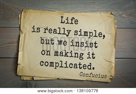 "Life is really simple, but we insist on making it complicated" Hard to swallow but inspirational truth by Chinese philosopher and politician of the Spring and Autumn period, Confucius. “Life is really simple, but we insist on making it complicated” – Confucius Do you find life very complicated at times?. CONFUCIUS Life is really simple, but men insist on making it complicated CONFUCIUS When nature exceeds culture, we have the rustic When culture exceeds nature then we the pedant CONFUCIUS Before you embark on a journey of revenge, dig two graves CONFUCIUS To be with God CONFUCIUS To know what is right and not do it is the worst cowardice.